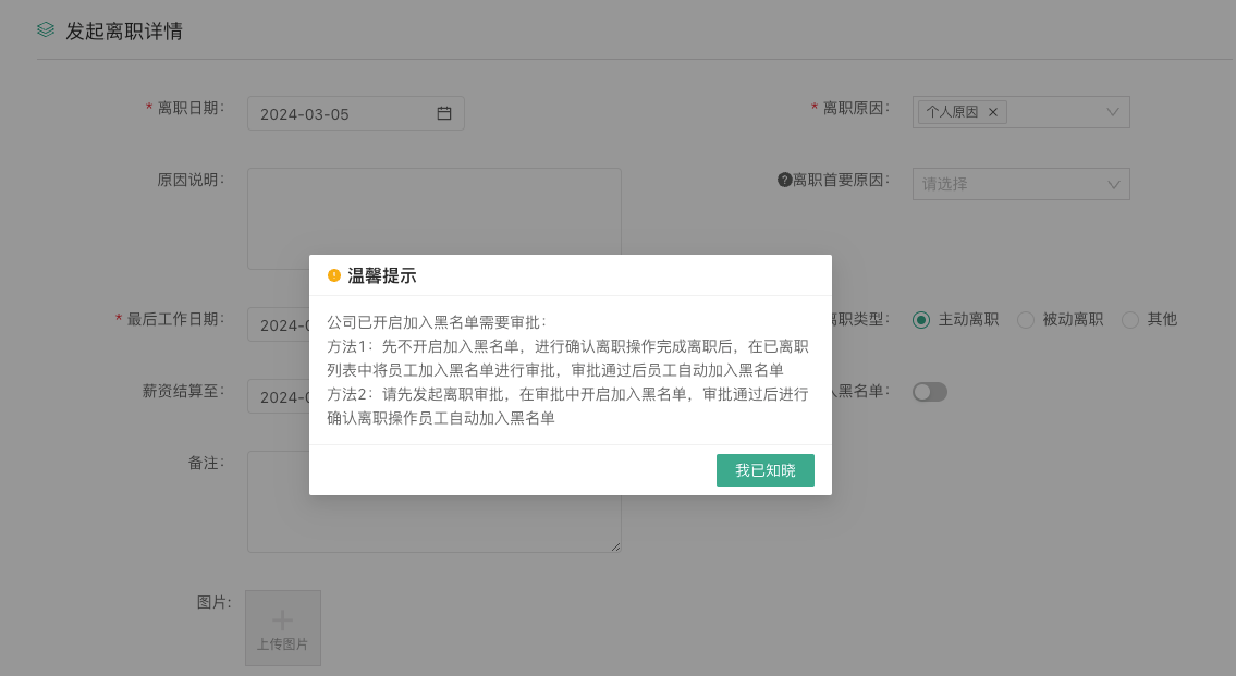 在使用利唐i人事HR系统时,当遇到存在违规行为且决定不再录用的员工,在其离职审批流程中,企业可将此类员工列入风险人员名单。